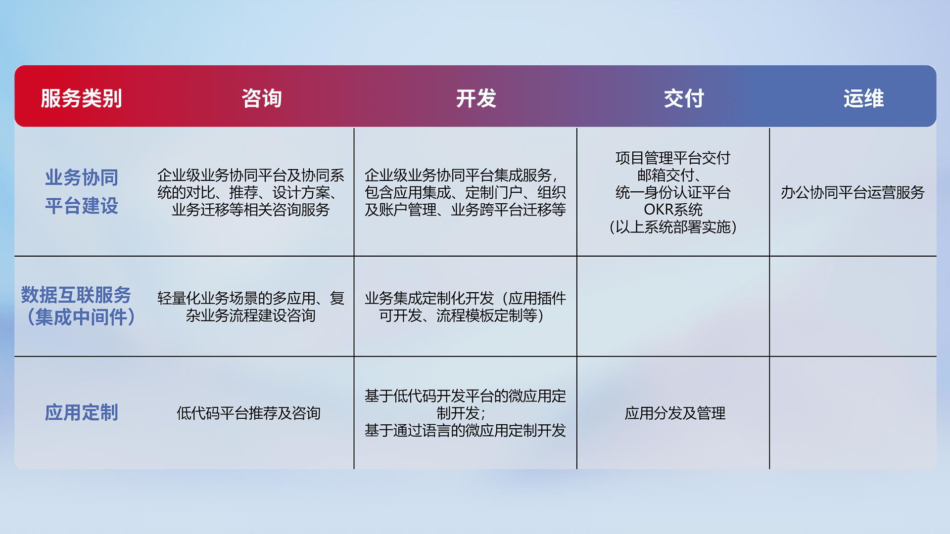 针对钉钉、、、企微、、、、IDaas等平台级产品提供产品的规划、、方案、、、交付、、、、定制化开发等服务,,,,实现如统一协同办公、、智能客户服务、、、混合会议管理、、、、智能数据查询、、等业务场景,,实现数字化转型。。。。